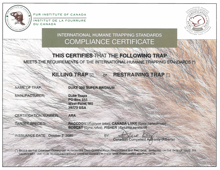 The new Duke 220 Super Mag has all the feature of the 330 just in a smaller 7″ x 7″ size. The 220 Super Magnum body grip trap with the magnum design allows for complete jaw closure. It has Ultra Powerful springs, Stay-Put spring safeties and a 4 way one piece bolt on Trigger System. This trap is great for Raccoon, Groundhog, Bobcat, Fisher and Otters.