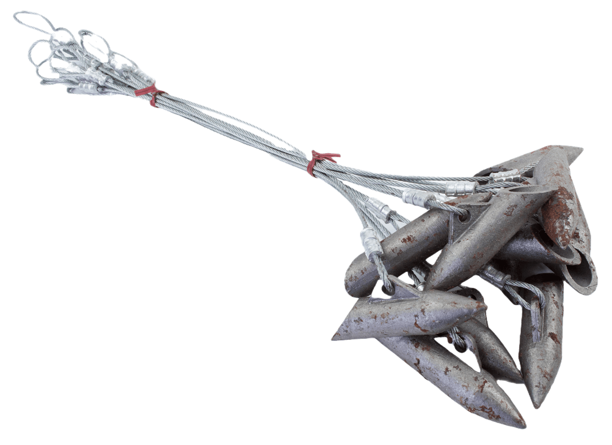 A lightweight anchor system. Stake ends are bullet point, one-piece cast steel. Each Super Stake comes with attached cable to make it 15″ long. End loops are large enough to let the stake end pass through so no extra connectors are need to attach the stakes to the swivel body that is already on most trap chains. Out of the box ready to use. Save when you buy the eleven dozen special. Requires a super stake driver for use.